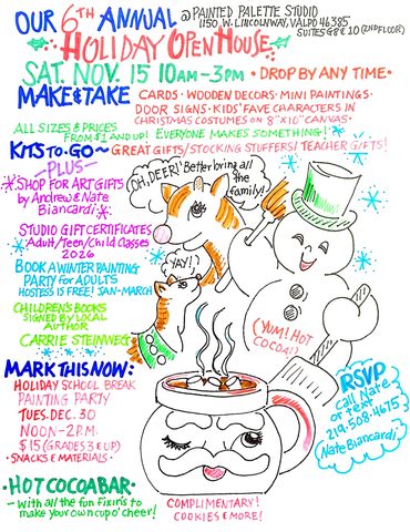 · 6th Annual Holiday Workshop Open House 2025 is for all ages Saturday November 15, 10a.m.-3 p.m. Winter and Christmas items will be available to make and take; items range from $3 up. Some are pre-wrapped take and make kits-- decors and glitter included in clear bags with a holiday bow to give as a gift or stocking stuffer.